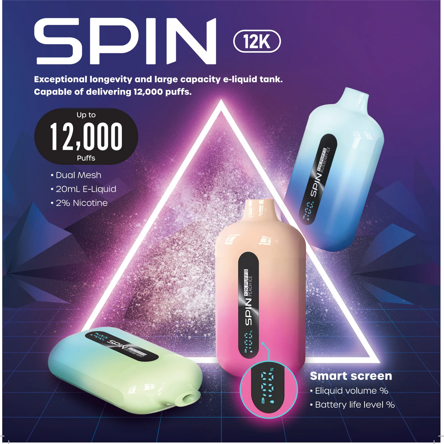 Coil: Dual Mesh Coil (non-replaceable) E-Liquid Capacity: 18mL Battery: 850mAh rechargeable Nicotine...